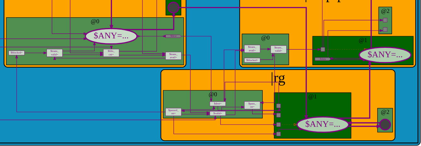 Your designs are represented in logic diagrams. TL-Verilog design hierarchy, including pipelines and pipeline stages, provides organization to your logic diagrams. Below, the path through $ANY ovals shows the flow a transaction will follow through an example design.