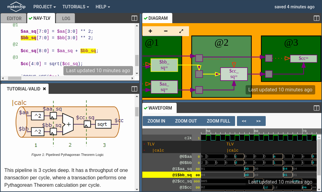 TL-Verilog constructs in the code editor, diagram, and waveform viewer are all linked together. Clicking an element such as a signal in one view will highlight that element across all views.