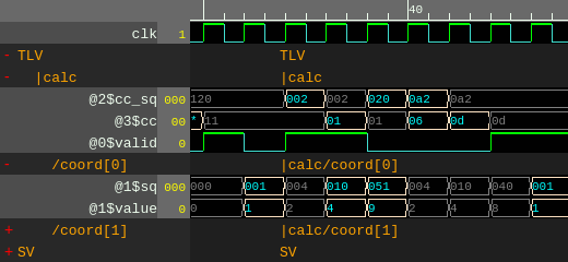 Waveforms are organized by TL-Verilog design hierarchy. Waveforms clearly show when signals are carrying meaningful data.